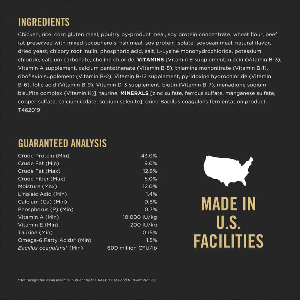 | Chicken, Rice, Corn Gluten Meal, Poultry By-product Meal, Soy Protein Concentrate, Wheat Flour, Beef Fat Preserved With Mixed-tocopherols, Fish Meal, Soy Protein Isolate, Soybean Meal, Natural Flavor, Dried Yeast, Chicory Root Inulin, Phosphoric Acid, Salt, L-lysine Monohydrochloride, Potassium Chloride, Calcium Carbonate, Choline Chloride, Vitamins [Vitamin E Supplement, Niacin (Vitamin B-3), Vitamin A Supplement, Calcium Pantothenate (Vitamin B-5), Thiamine Mononitrate (Vitamin B-1), Riboflavin Supplement (Vitamin B-2), Vitamin B-12 Supplement, Pyridoxine Hydrochloride (Vitamin B-6), Folic Acid (Vitamin B-9), Vitamin D-3 Supplement, Biotin (Vitamin B-7), Menadione Sodium Bisulfite Complex (Vitamin K)], Taurine, Minerals [Zinc Sulfate, Ferrous Sulfate, Manganese Sulfate, Copper Sulfate, Calcium Iodate, Sodium Selenite], Dried Bacillus Coagulans Fermentation Product. T462019 |