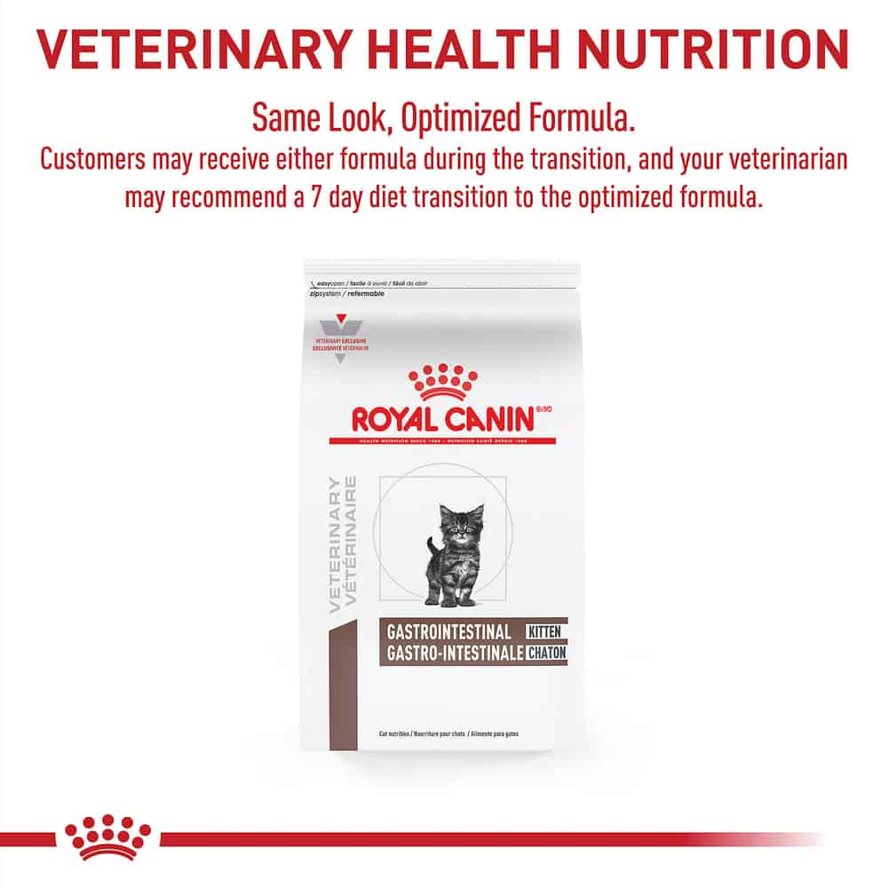 - When feeding Dry + Wet, this food is best mixed with Royal Canin Veterinary Diet Feline Gastrointestinal Kitten Ultra Soft Mousse in Sauce Canned Wet Cat Food.