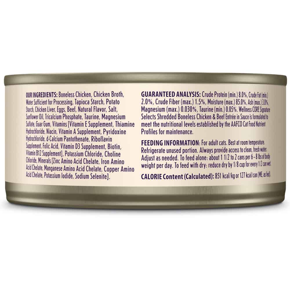 | Wellness CORE Signature Selects Shredded Boneless Chicken & Beef Entrée in Sauce is formulated to meet the nutritional levels established by the AAFCO Cat Food Nutrient Profiles for maintenance. |