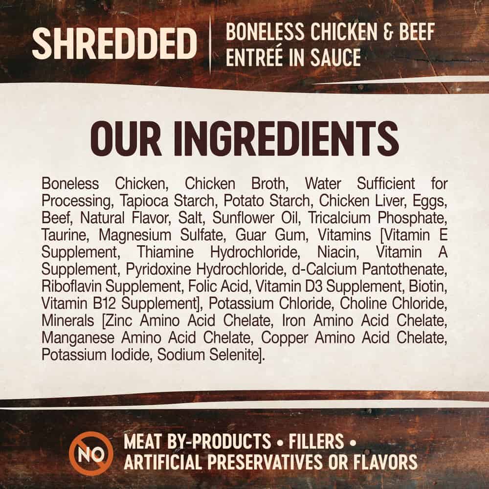 - SHREDDED CHICKEN AND BEEF: All-natural wet food delivers what your cat craves. Protein-rich recipe features delicate shreds of chicken and beef in a delicious sauce that supports daily hydration. We recommend serving at room temperature for maximum palatability.