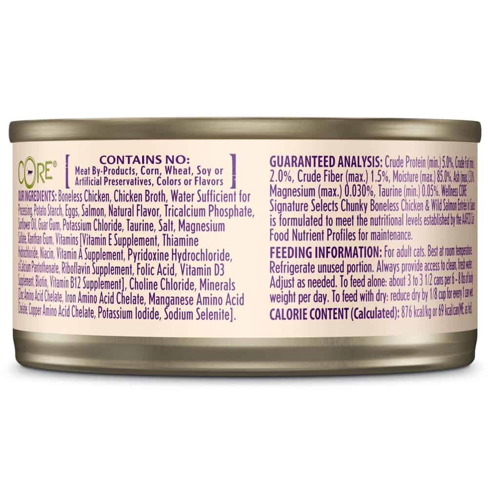 | Wellness CORE Signature Selects Chunky Boneless Chicken & Wild Salmon Entrée in Sauce is formulated to meet the nutritional levels established by the AAFCO Cat Food Nutrient Profiles for maintenance. |