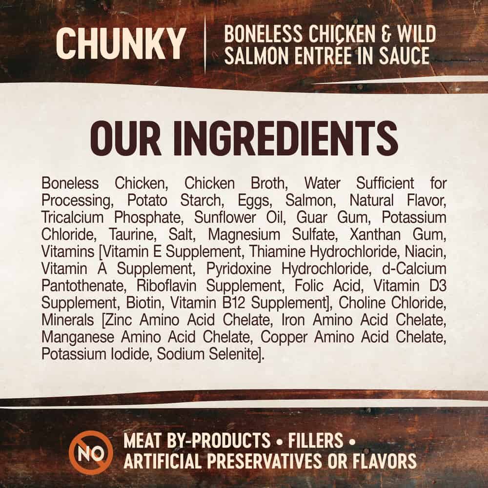 - CHUNKY CHICKEN AND SALMON: All-natural wet food delivers what your cat craves. Protein-rich recipe features chunks of chicken and salmon in a delicious sauce that supports daily hydration. We recommend serving at room temperature for maximum palatability.