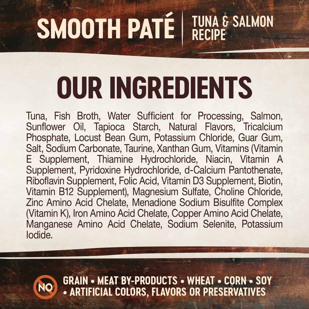 | Tuna, Fish Broth, Water Sufficient for Processing, Salmon, Sunflower Oil, Tapioca Starch, Natural Flavors, Tricalcium Phosphate, Locust Bean Gum, Potassium Chloride, Guar Gum, Salt, Sodium Carbonate, Taurine, Xanthan Gum, Vitamins (Vitamin E Supplement, Thiamine Hydrochloride, Niacin, Vitamin A Supplement, Pyridoxine Hydrochloride, d-Calcium Pantothenate, Riboflavin Supplement, Folic Acid, Vitamin D3 Supplement, Biotin, Vitamin B12 Supplement), Magnesium Sulfate, Choline Chloride, Zinc Amino Acid Chelate, Menadione Sodium Bisulfite Complex (Vitamin K), Iron Amino Acid Chelate, Copper Amino Acid Chelate, Manganese Amino Acid Chelate, Sodium Selenite, Potassium Iodide. |