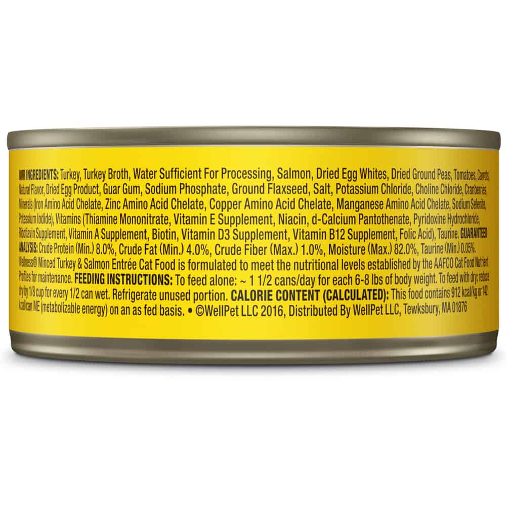 | Wellness® Minced Turkey & Salmon Entrée Cat Food is formulated to meet the nutritional levels established by the AAFCO Cat Food Nutrient Profiles for maintenance. | |