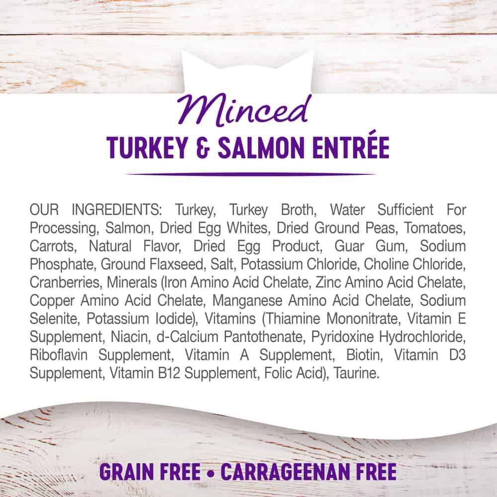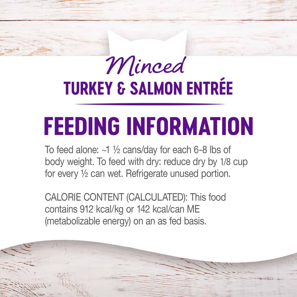 - MINCED TURKEY & SALMON: This natural food for adult cats is an excellent source of high quality proteins, packed with vitamins, minerals, and essential fatty acids for complete, balanced nutrition. Wet food features very tiny chopped pieces of turkey & salmon served in light gravy.