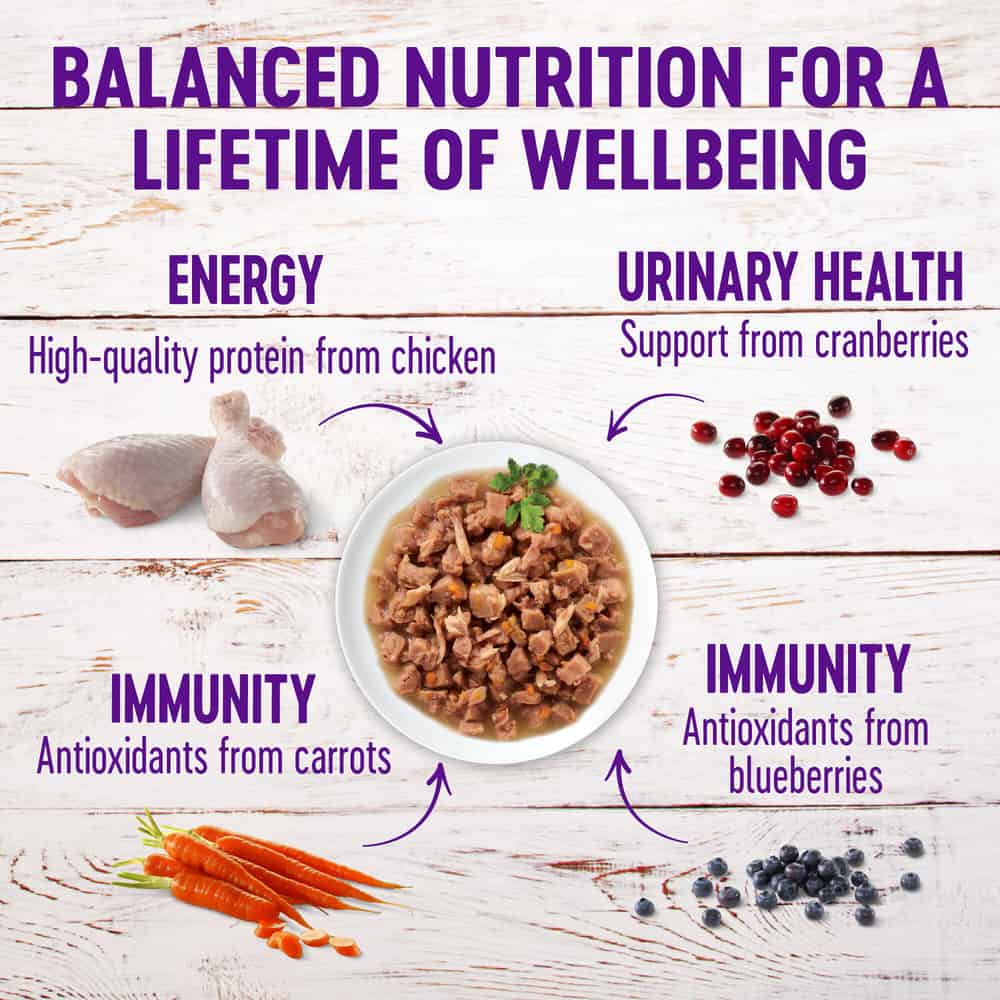 | Chicken Broth, Water Sufficient For Processing, Chicken, Turkey, Potato Starch, Eggs, Carrots, Chicken Liver, Natural Flavor, Salt, Guar Gum, Tricalcium Phosphate, Potassium Chloride, Taurine, Magnesium Sulfate, Vitamins [Vitamin E Supplement, Thiamine Hydrochloride, Niacin, Vitamin A Supplement, Pyridoxine Hydrochloride, d-Calcium Pantothenate, Riboflavin Supplement, Folic Acid, Vitamin D3 Supplement, Biotin, Vitamin B12 Supplement], Cranberries, Blueberries, White Sweet Potatoes, Xanthan Gum, Choline Chloride, Zinc Amino Acid Chelate, Iron Amino Acid Chelate, Manganese Amino Acid Chelate, Copper Amino Acid Chelate, Potassium Iodide, Sodium Selenite. |
