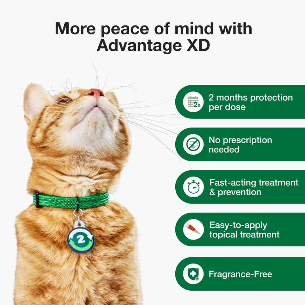 Advantage® XD is an easy-to-apply topical flea treatment for cats. It packs 2 full months of treatment and continuous protection in each dose, lasting longer than traditional 1-month formulas. This topical, spot-on formula goes on easily in seconds (see product label for more information). Advantage® XD starts killing fleas through contact in 30 minutes to 4 hours. Advantage XD kills fleas through contact, so they don't have to bite your cat to die. Advantage XD continues to kill fleas for 2 months, which outlasts the typical six week flea life cycle and prevents reinfestations. Even indoor cats need flea protection because humans and other pets can bring fleas into your home. This convenient topical solution is fragrance-free and waterproof after 24 hours.