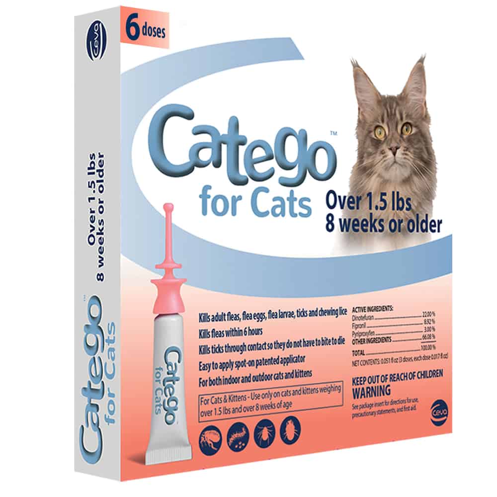 Catego for Cats provides convenient, fast-acting, and effective flea and tick control in cats and kittens. It is effective against all stages of the Brown dog ticks (Rhipicephalus sanguineus), American dog ticks (Dermacentor variabilis), Lone Star ticks (Amblyomma americanum), and Deer ticks (Ixodes scapularis). It also kills flea eggs, flea larvae, and chewing lice.