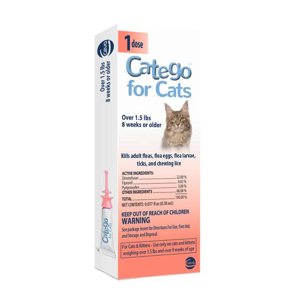 Catego for Cats provides convenient, fast-acting, and effective flea and tick control in cats and kittens. It is effective against all stages of the Brown dog ticks (Rhipicephalus sanguineus), American dog ticks (Dermacentor variabilis), Lone Star ticks (Amblyomma americanum), and Deer ticks (Ixodes scapularis). It also kills flea eggs, flea larvae, and chewing lice.