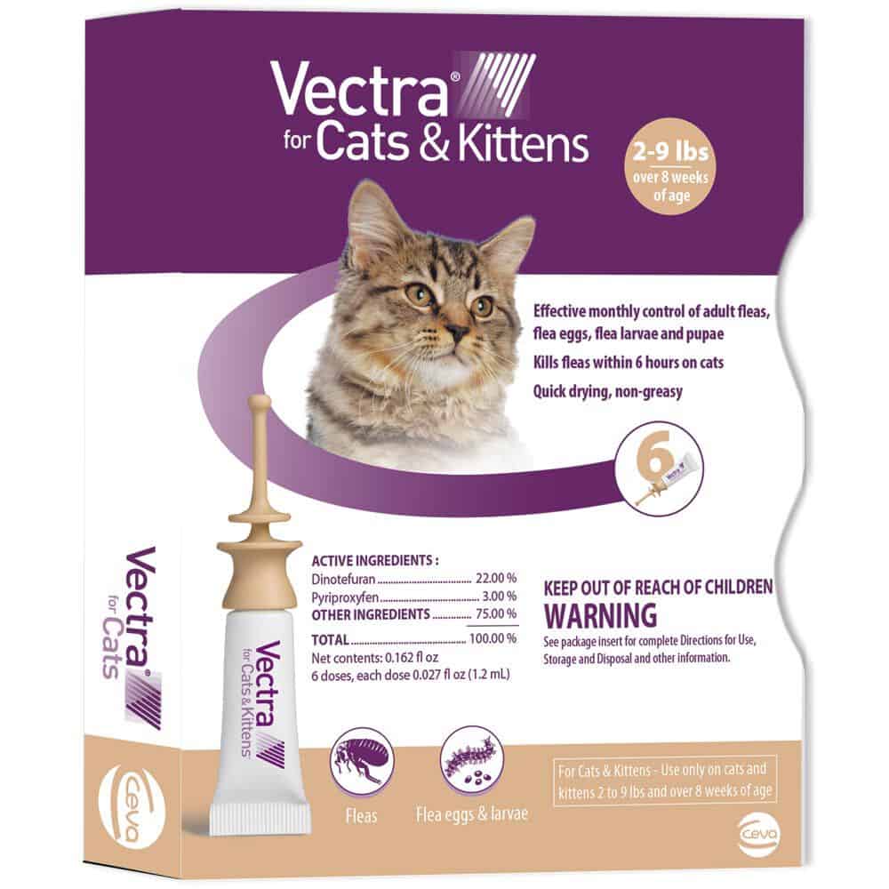 Vectra for Cats is an effective, topical solution for cats and kittens over 8 weeks of age, providing control of adult fleas, flea eggs, and flea larvae and pupae. It kills fleas within 6 hours of application and protects your cat or kitten from all stages of fleas for one month. This topical solution is quick drying, non-greasy and comes in an easy-to-use applicator. Vectra for Cats kills fleas that may transmit diseases, including bartonellosis, tapeworm, and tularemia. It also kills fleas that may cause flea allergy dermatitis and anemia.