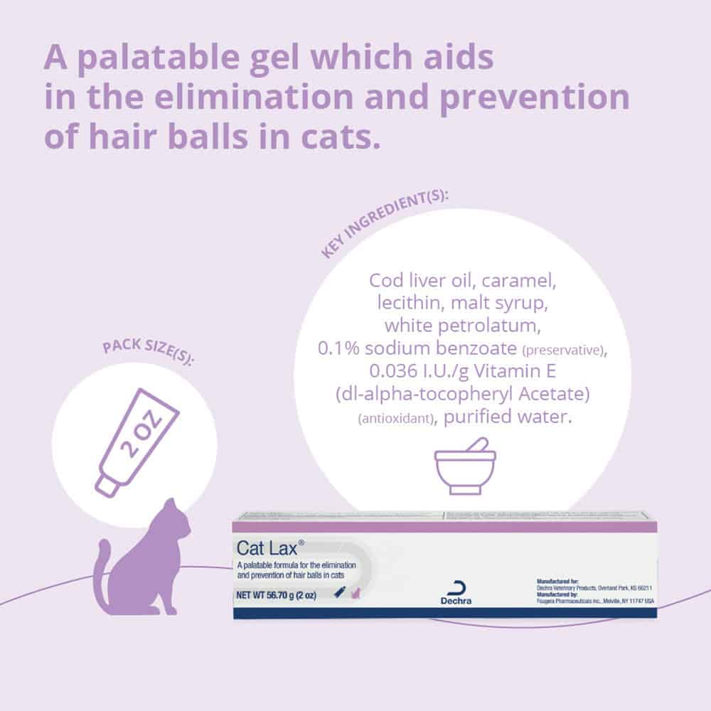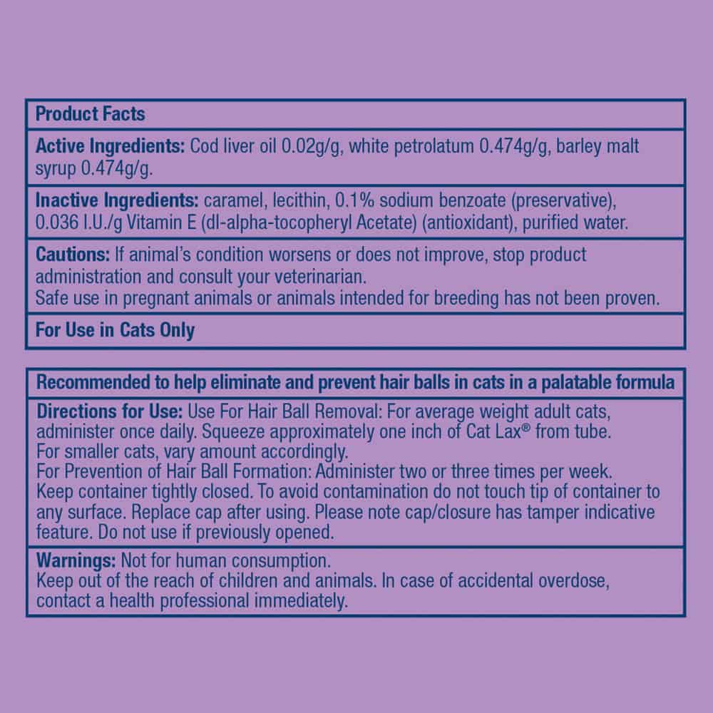 Eliminate and prevent troublesome hairballs with Cat Lax Cat Supplement, a highly palatable, petroleum-based gel. Formulated with White Petrolatum to lubricate the digestive tract and Cod Liver Oil for added Omega-3 benefits, it allows swallowed hair to pass easily through the system. Cat Lax Cat Supplement is a proactive solution that prevents hair accumulation in the stomach, ensuring better digestive comfort and fewer messes for cat owners.
