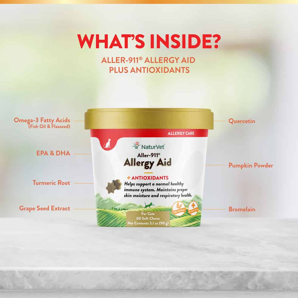 NaturVet Aller-911 Allergy Aid Plus Antioxidants Supplement helps support the immune system, respiratory health, and proper skin moisture.