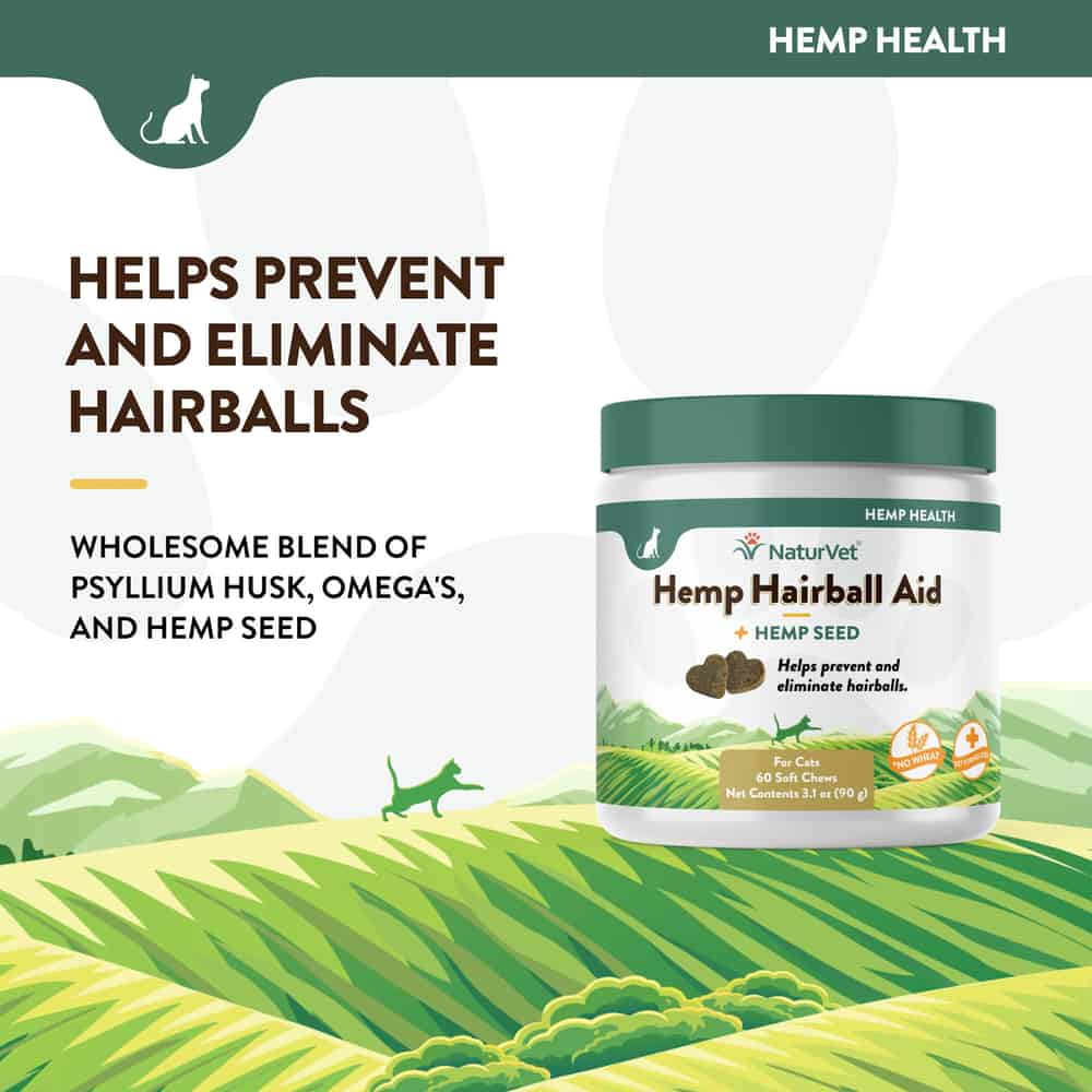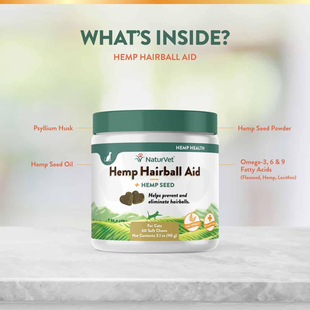 - Psyllium Husk and Hemp Seed help to prevent and eliminate and hairballs in cats when used on a daily basis.