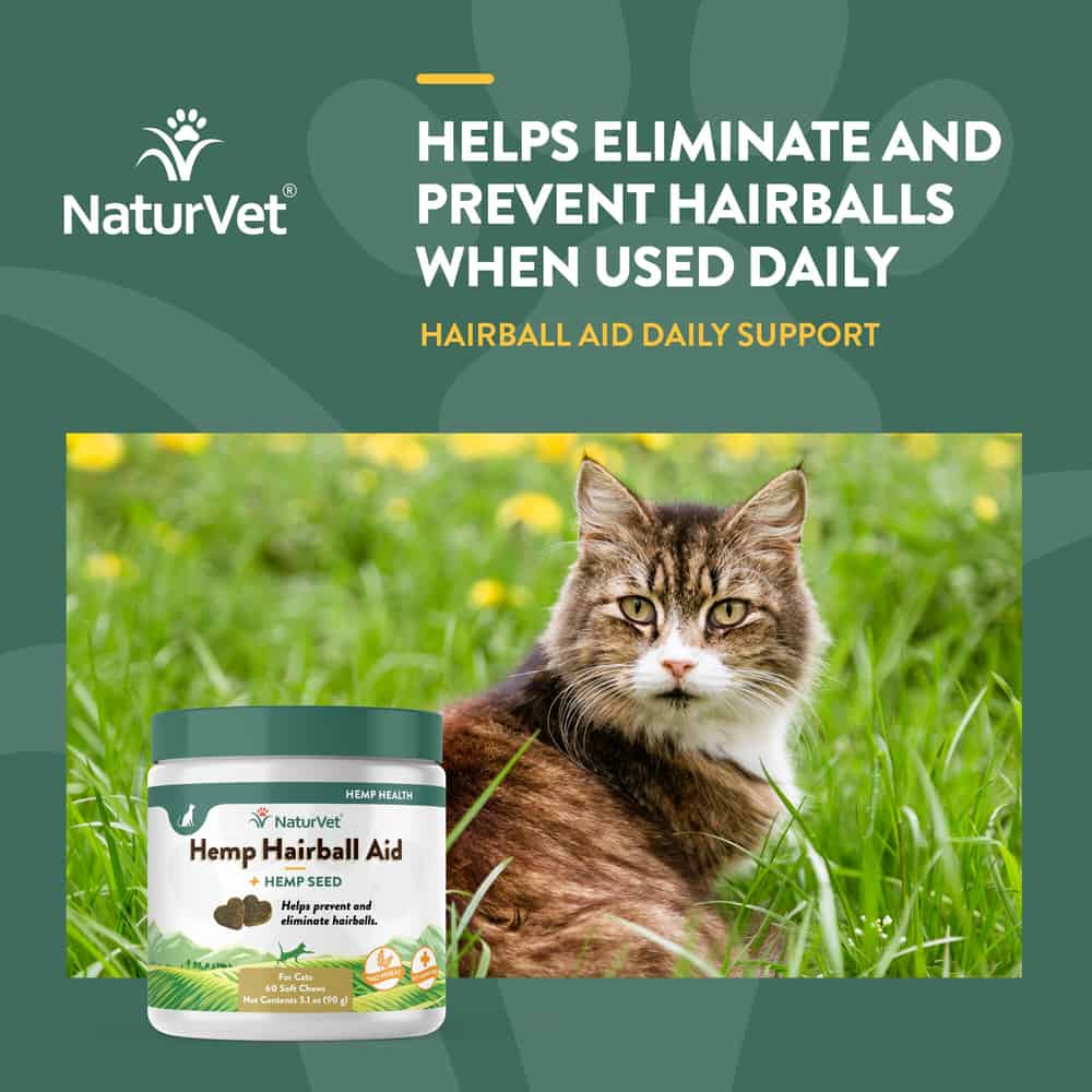 NaturVet Hemp Hairball Aid Plus Hemp Seed Supplement helps to prevent and eliminate hairballs in cats when used on a daily basis.