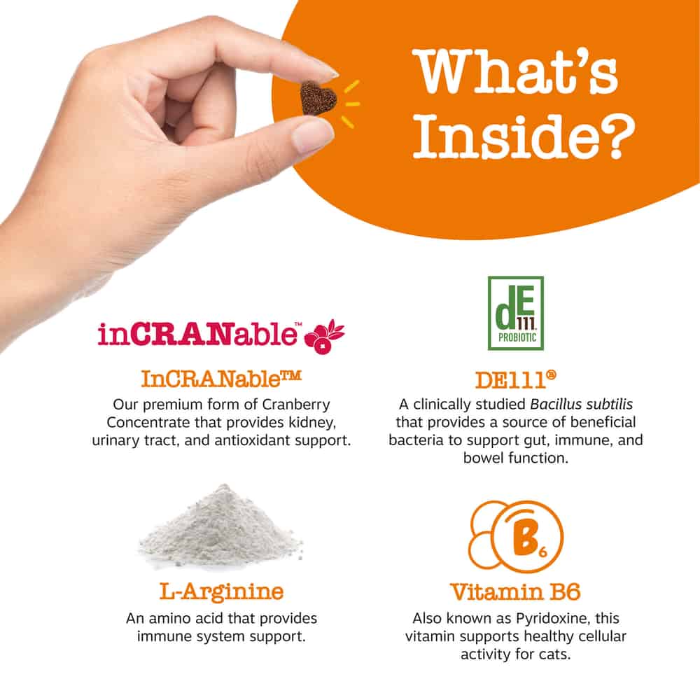 - Made with InCRANable – These chewables contain a premium form of Cranberry Concentrate to provide kidney, urinary tract, and antioxidant support for cats of all ages, breeds, and sizes.