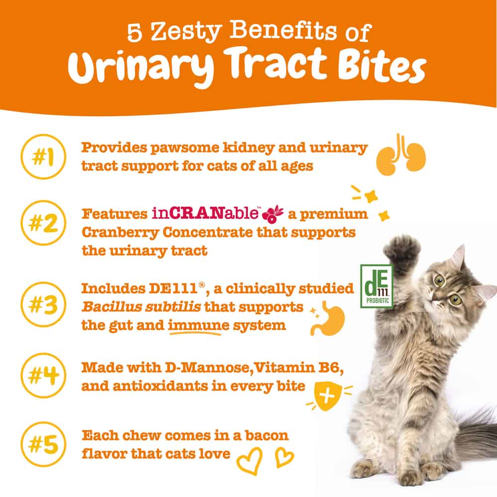 - Support You 'CRAN' Believe In! – Zesty Paws Urinary Tract Bites are supplements with antioxidants, D-Mannose, healthy bacteria, and other ingredients that support your cat when nature calls.