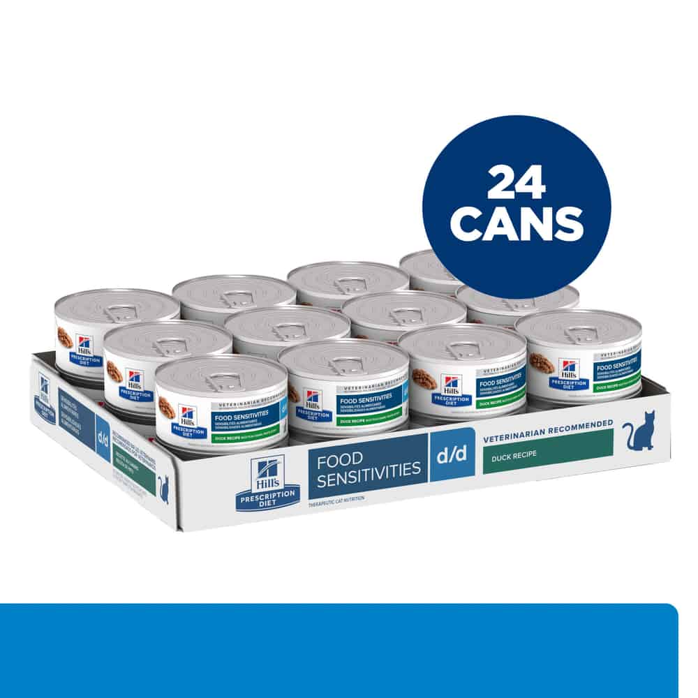 - Hill's Prescription Diet d/d Food Sensitivities Duck Formula Wet Cat Food is specially formulated by Hill’s nutritionists and veterinarians to support your cat’s food sensitivities.