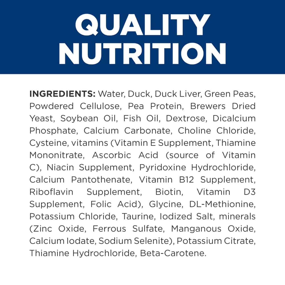 | Water, Duck, Duck Liver, Green Peas, Powdered Cellulose, Pea Protein, Brewers Dried Yeast, Soybean Oil, Fish Oil, Dextrose, Dicalcium Phosphate, Calcium Carbonate, Choline Chloride, Cysteine, vitamins (Vitamin E Supplement, Thiamine Mononitrate, Ascorbic Acid (source of Vitamin C), Niacin Supplement, Pyridoxine Hydrochloride, Calcium Pantothenate, Vitamin B12 Supplement, Riboflavin Supplement, Biotin, Vitamin D3 Supplement, Folic Acid), Glycine, DL-Methionine, Potassium Chloride, Taurine, Iodized Salt, minerals (Zinc Oxide, Ferrous Sulfate, Manganous Oxide, Calcium Iodate, Sodium Selenite), Potassium Citrate, Thiamine Hydrochloride, Beta-Carotene. |