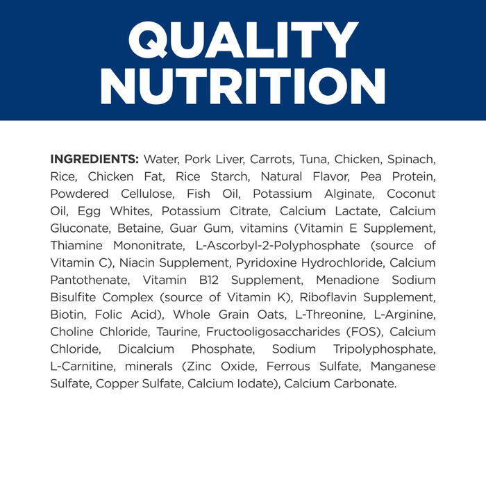 Water, Pork Liver, Carrots, Tuna, Chicken, Spinach, Rice, Chicken Fat, Rice Starch, Natural Flavor, Pea Protein, Powdered Cellulose, Fish Oil, Potassium Alginate, Coconut Oil, Egg Whites, Potassium Citrate, Calcium Lactate, Calcium Gluconate, Betaine, Guar Gum, vitamins (Vitamin E Supplement, Thiamine Mononitrate, L-Ascorbyl-2-Polyphosphate (source of Vitamin C), Niacin Supplement, Pyridoxine Hydrochloride, Calcium Pantothenate, Vitamin B12 Supplement, Menadione Sodium Bisulfite Complex (source of Vitamin K), Riboflavin Supplement, Biotin, Folic Acid), Whole Grain Oats, L-Threonine, L-Arginine, Choline Chloride, Taurine, Fructooligosaccharides (FOS), Calcium Chloride, Dicalcium Phosphate, Sodium Tripolyphosphate, L-Carnitine, minerals (Zinc Oxide, Ferrous Sulfate, Manganese Sulfate, Copper Sulfate, Calcium Iodate), Calcium Carbonate.