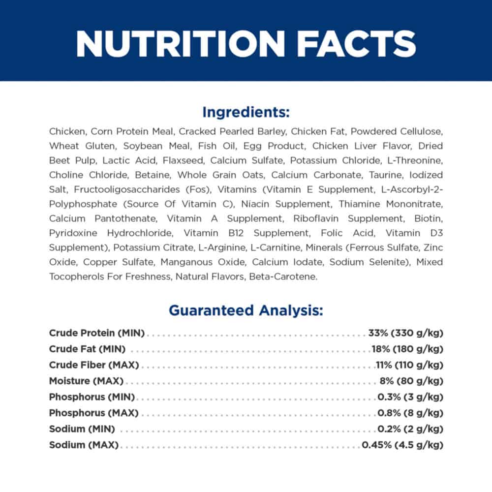 | Chicken, Corn Protein Meal, Cracked Pearled Barley, Chicken Fat, Powdered Cellulose, Wheat Gluten, Soybean Meal, Fish Oil, Egg Product, Chicken Liver Flavor, Dried Beet Pulp, Lactic Acid, Flaxseed, Calcium Sulfate, Potassium Chloride, L-Threonine, Choline Chloride, Betaine, Whole Grain Oats, Calcium Carbonate, Taurine, lodized Salt, Fructooligosaccharides (Fos), Vitamins (Vitamin E Supplement, L-Ascorbyl-2- Polyphosphate (Source Of Vitamin C), Niacin Supplement, Thiamine Mononitrate, Calcium Pantothenate, Vitamin A Supplement, Riboflavin Supplement, Biotin, Pyridoxine Hydrochloride, Vitamin B12 Supplement, Folic Acid, Vitamin D3 Supplement), Potassium Citrate, L-Arginine, L-Carnitine, Minerals (Ferrous Sulfate, Zinc Oxide, Copper Sulfate, Manganous Oxide, Calcium lodate, Sodium Selenite), Mixed Tocopherols For Freshness, Natural Flavors, Beta-Carotene. |
