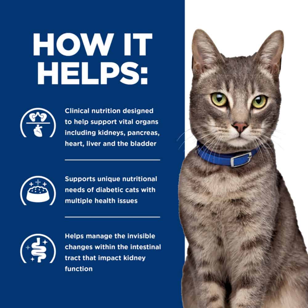 - Hill's Prescription Diet Multi-Organ Chicken Flavor Dry Cat Food is specially formulated by Hill’s nutritionists and veterinarians to support unique nutritional needs of diabetic cats with multiple health issues