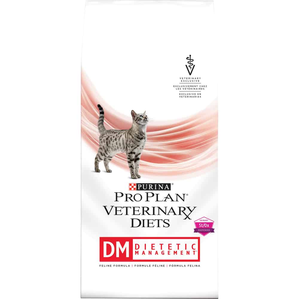 Purina Pro Plan Veterinary Diets DM Dietetic Management Feline Formulas are high protein and low carbohydrate to help support the unique nutritional needs of diabetic cats. This diet also promotes a urinary environment unfavorable to the development of both struvite and calcium oxalate crystals.