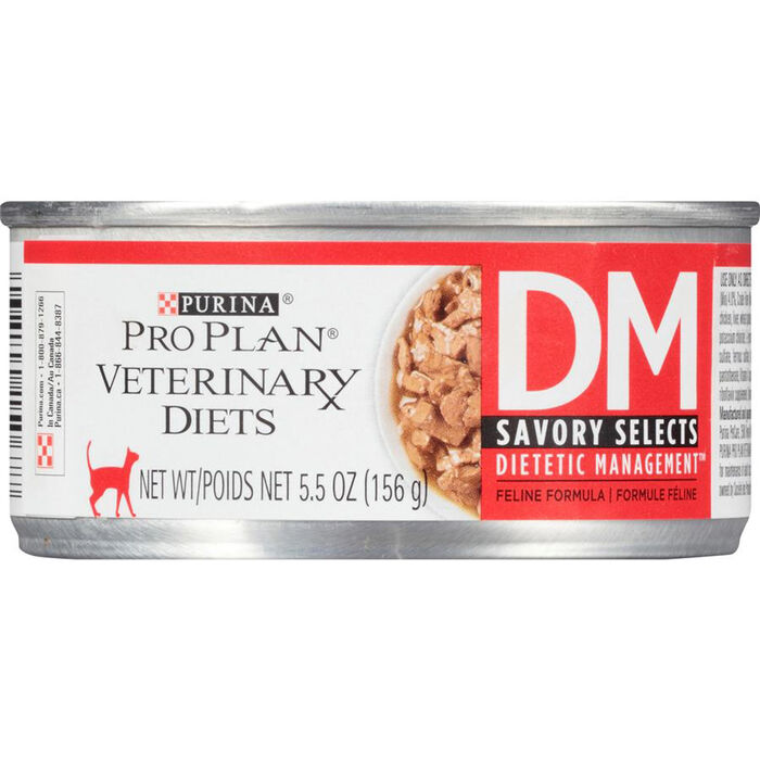 Purina Pro Plan Veterinary Diets DM Dietetic Management Feline Formulas are high protein and low carbohydrate to help support healthy glucose levels in cats. This diet also promotes a urinary environment unfavorable to the development of both struvite and calcium oxalate crystals.
