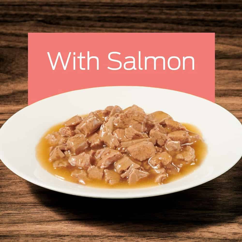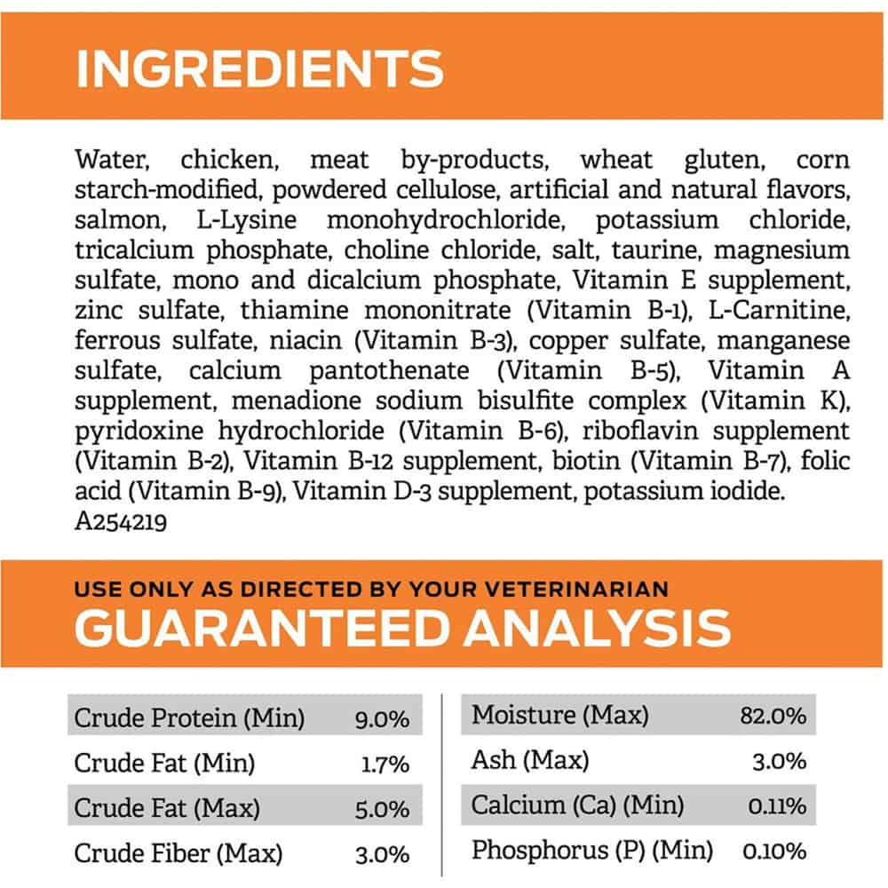 | Water, chicken, meat by-products, wheat gluten, corn starch-modified, powdered cellulose, artificial and natural flavors, salmon, L-Lysine monohydrochloride, potassium chloride, tricalcium phosphate, choline chloride, salt, taurine, magnesium sulfate, mono and dicalcium phosphate, Vitamin E supplement, zinc sulfate, thiamine mononitrate (Vitamin B-1), L-Carnitine, ferrous sulfate, niacin (Vitamin B-3), copper sulfate, manganese sulfate, calcium pantothenate (Vitamin B-5), Vitamin A supplement, menadione sodium bisulfite complex (Vitamin K), pyridoxine hydrochloride (Vitamin B-6), riboflavin supplement (Vitamin B-2), Vitamin B-12 supplement, biotin (Vitamin B-7), folic acid (Vitamin B-9), Vitamin D-3 supplement, potassium iodide. A254219. |