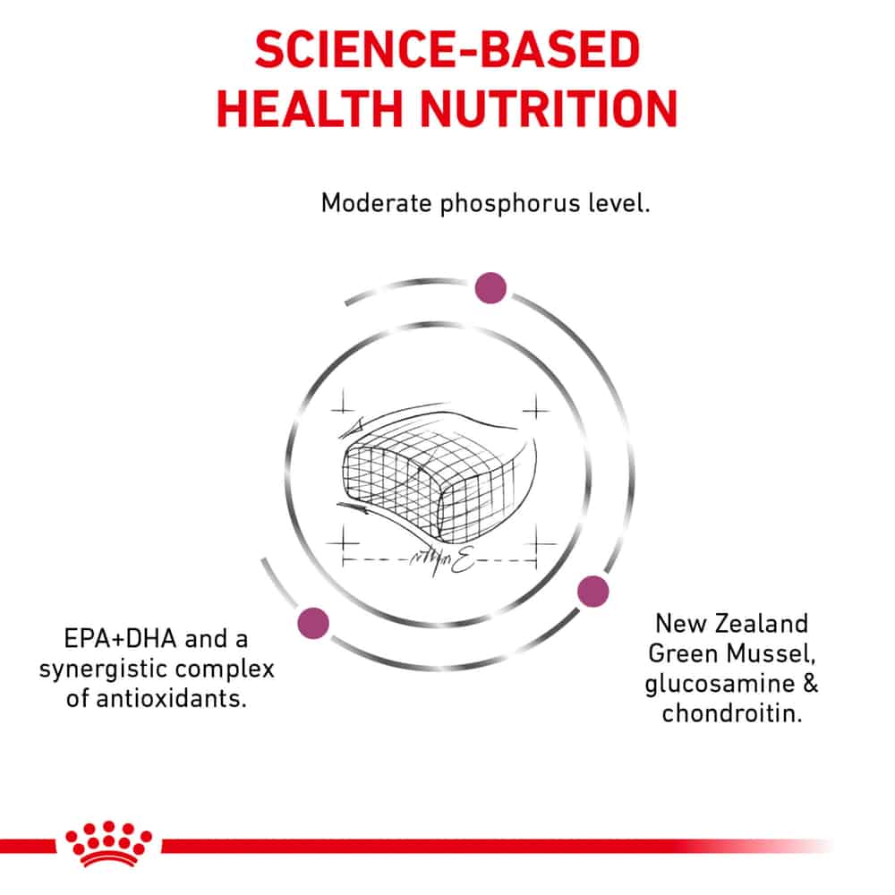It helps to support kidneys at an early stage with moderate phosphorus levels and an antioxidant complex. This highly palatable dry food is also formulated with nutrients, including prebiotics, and New Zealand Green Mussel, to help support cats with early signs of aging. It also helps deliver a moderate phosphorus level, glucosamine, and chondroitin. This dry cat food also features S/O index to help promote a healthy urinary environment.