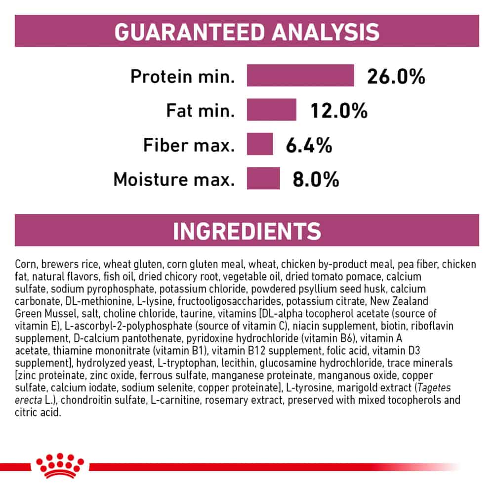 | Corn, brewers rice, wheat gluten, corn gluten meal, wheat, chicken by-product meal, pea fiber, chicken fat, natural flavors, fish oil, dried chicory root, vegetable oil, dried tomato pomace, calcium sulfate, sodium pyrophosphate, potassium chloride, powdered psyllium seed husk, calcium carbonate, DL-methionine, L-lysine, fructooligosaccharides, potassium citrate, New Zealand Green Mussel, salt, choline chloride, taurine, vitamins [DL-alpha tocopherol acetate (source of vitamin E), L-ascorbyl-2-polyphosphate (source of vitamin C), niacin supplement, biotin, riboflavin supplement, D-calcium pantothenate, pyridoxine hydrochloride (vitamin B6), vitamin A acetate, thiamine mononitrate (vitamin B1), vitamin B12 supplement, folic acid, vitamin D3 supplement], hydrolyzed yeast, L-tryptophan, lecithin, glucosamine hydrochloride, trace minerals [zinc proteinate, zinc oxide, ferrous sulfate, manganese proteinate, manganous oxide, copper sulfate, calcium iodate, sodium selenite, copper proteinate], L-tyrosine, marigold extract (Tagetes erecta L.), chondroitin sulfate, L-carnitine, rosemary extract, preserved with mixed tocopherols and citric acid. |