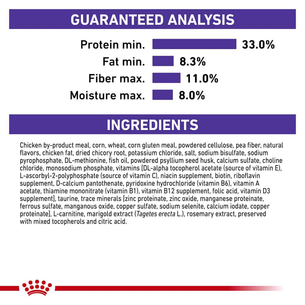 | Chicken by-product meal, corn, wheat, corn gluten meal, powdered cellulose, pea fiber, natural flavors, chicken fat, dried chicory root, potassium chloride, salt, sodium bisulfate, sodium pyrophosphate, DL-methionine, fish oil, powdered psyllium seed husk, calcium sulfate, choline chloride, monosodium phosphate, vitamins [DL-alpha tocopherol acetate (source of vitamin E), L-ascorbyl-2-polyphosphate (source of vitamin C), niacin supplement, biotin, riboflavin supplement, D-calcium pantothenate, pyridoxine hydrochloride (vitamin B6), vitamin A acetate, thiamine mononitrate (vitamin B1), vitamin B12 supplement, folic acid, vitamin D3 supplement], taurine, trace minerals [zinc proteinate, zinc oxide, manganese proteinate, ferrous sulfate, manganous oxide, copper sulfate, sodium selenite, calcium iodate, copper proteinate], L-carnitine, marigold extract (Tagetes erecta L.), rosemary extract, preserved with mixed tocopherols and citric acid. |