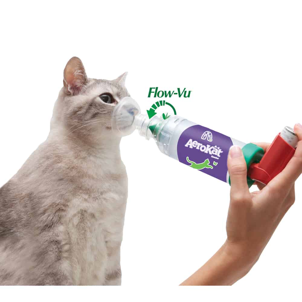 - As your cat inhales, depress the inhaler and hold mask in place for 5 to 6 breaths. Maintain an effective seal and use the Flow-Vu to assist in breath counting. Ensure the veterinarian's dosage instructions are followed and that only one puff of medication is delivered at a time.