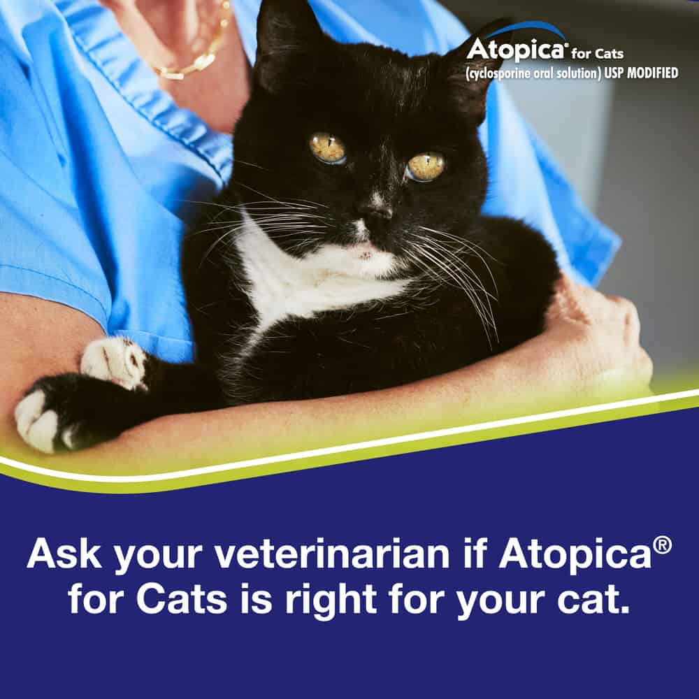 Atopica for Cats is an oral solution used to control feline allergic dermatitis (allergic skin disease) as seen as broken skin, including facial and neck (miliary dermatitis, eosinophilic plaques, and self-induced alopecia). Signs of allergic skin disease include itching, chewing, licking, skin lesions and hair loss. Some cats may develop lesions that may even appear on the face and neck. Atopica requires a prescription from your veterinarian. For atopic dermatitis in dogs, we recommend Atopica for Dogs.