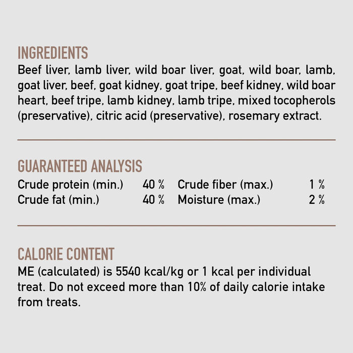 Beef liver, lamb liver, wild boar liver, goat, wild boar, lamb, goat liver, beef, goat kidney, goat tripe, beef kidney, wild boar heart, beef tripe, lamb kidney, lamb tripe, mixed tocopherols (preservative), citric acid (preservative), rosemary extract.
