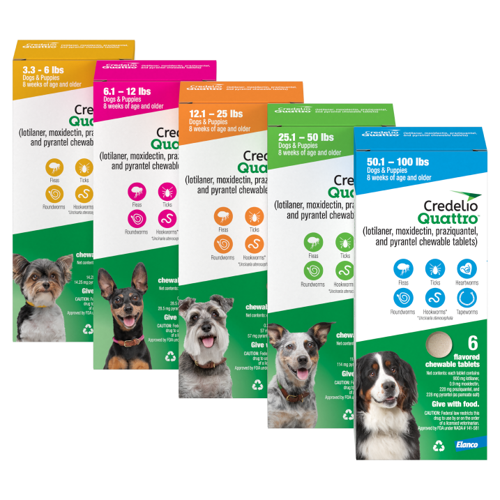 Credelio Quattro is indicated for the prevention of heartworm disease caused by Dirofilaria immitis and for the treatment and control of roundworm (immature adult and adult Toxocara canis and adult Toxascaris leonina), hookworm (adult Unicaria stenocelphala), and tapeworm (Dipylidium caninum, Taenia pisiformis, and Echinococcus granulosus) infections.Credelio Quattro kills adult fleas and is indicated for the treatment and prevention of flea infestations (Ctenocephalides felis) and the treatment and control of tick infestations [Amblyomma americanum (lone star tick), Dermacentor variabilis (American dog tick), Ixodes scapularis (black-legged tick) and Rhipicephalus sanguineus (brown dog tick)] for one month in dogs and puppies 8 weeks of age and older and weighing 3.3 pounds or greater.