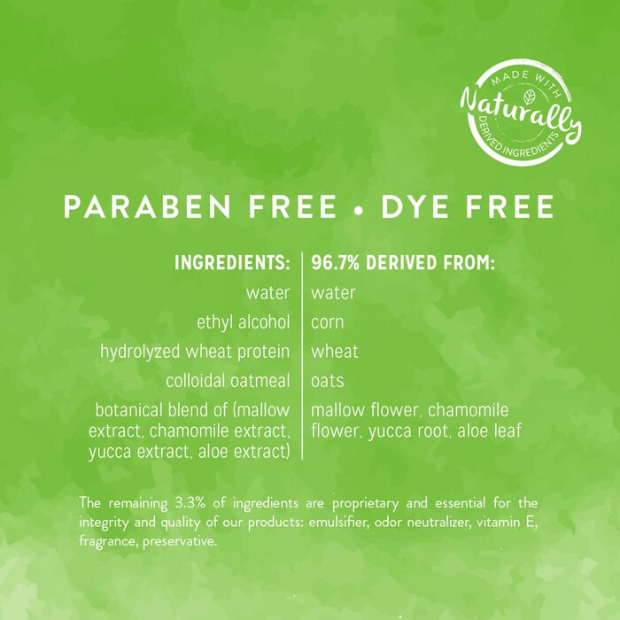 | Other Ingredients:Water, Ethyl Alcohol, Hydrolyzed Wheat Protein, Colloidal Oatmeal, Botanical Blend of (Mallow Extract, Chamomile Extract, Yucca Extract, Aloe Extract), Emulsifier, Odor Neutralizer, Vitamin E, Fragrance, Preservative |