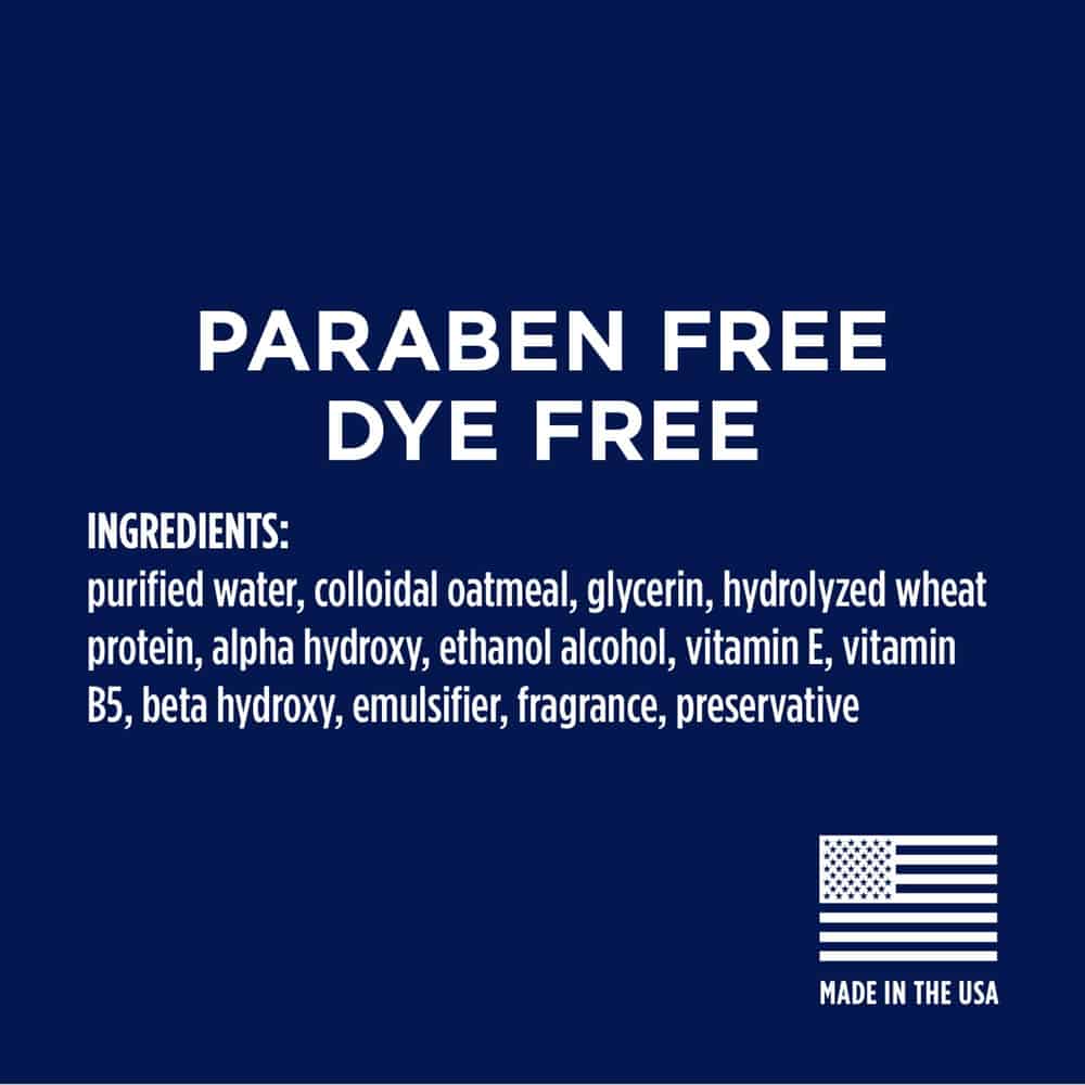 | Active Ingredients: Purified Water, Colloidal Oatmeal, Glycerin, Hydrolyzed Wheat Protein, Alpha Hydroxy, Ethanol Alcohol, Vitamin E, Vitamin B5, Beta Hydroxy, Emulsifier, Fragrance, Preservative |