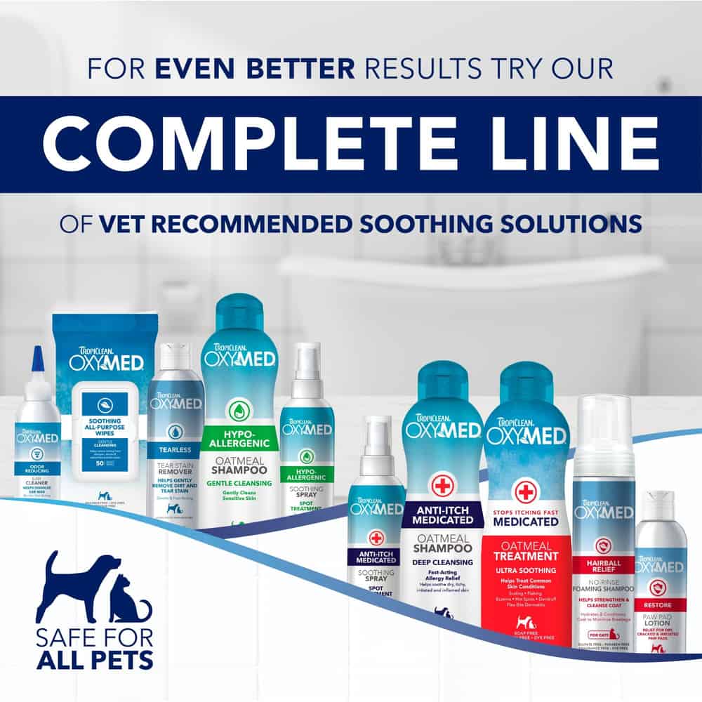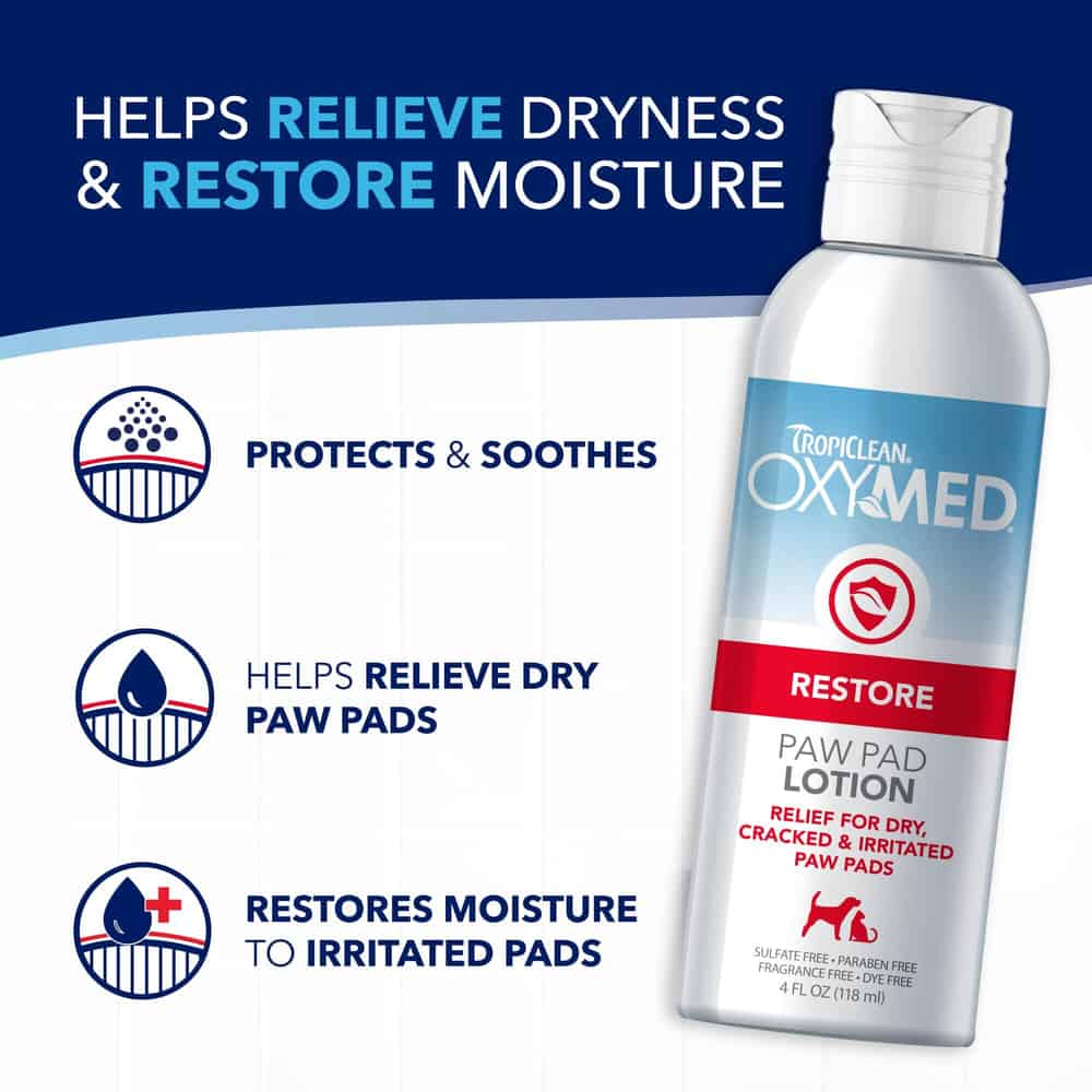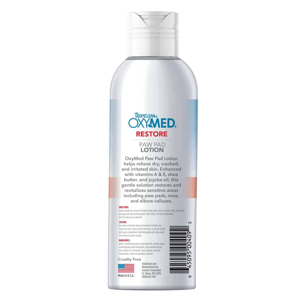 Provides effective relief for dry, cracked, irritated dog paw pads, snouts, and other thick or sensitive skin areas. Light and creamy moisturizer quickly absorbs into thick skin tissue to help soothe and hydrate sore, itchy paw pads without leaving greasy paw prints. Dry, cracked, and irritated paw pads, snouts, and elbow calluses can turn into more serious conditions if not addressed quickly. OxyMed Paw Pad Lotion helps keep damage-prone, sensitive areas healthy and protected from further cracking and irritation. Enriched with a nourishing blend of vitamin A & E, shea butter, and jojoba oil to revitalize sensitive skin areas. Creamy formula leaves no residue behind. Soothing lotion helps protect sensitive paws from damage caused by turf burn or abrasive surfaces. Lotion is sulfate, paraben, fragrance, and dye free. Family Owned - TropiClean products are proudly made in the U.S.A by pet lovers like you. TropiClean Pet Products offers a full range of naturally derived dog and cat products including TropiClean Grooming Products, SPA by TropiClean, TropiClean OxyMed, TropiClean PerfectFur, TropiClean Enticers, and TropiClean Fresh Breath Oral Care and Dental Products. For dogs and cats 12 weeks and older. Contains one (1) 4oz bottle of TropiClean OxyMed Paw Pad Lotion
