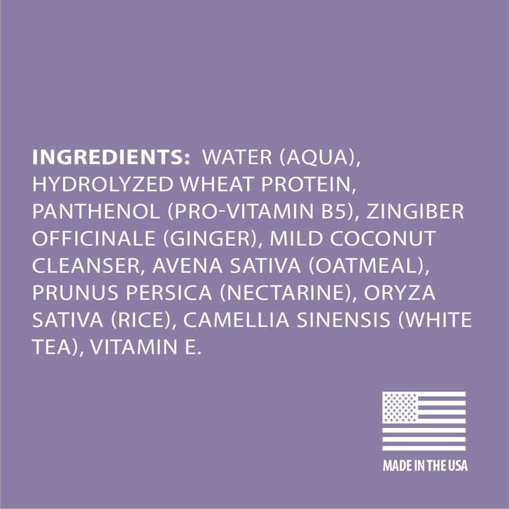 | Other Ingredients: Water (Aqua), Hydrolyzed Wheat Protein, Panthenol (Pro-Vitamin B5), Zingiber Officinale (Ginger), Mild Coconut Cleanser, Avena Sativa (Oatmeal), Prunus Persica (Nectarine), Oryza Sativa (Rice), Camellia Sinensis (White Tea), Vitamin E |