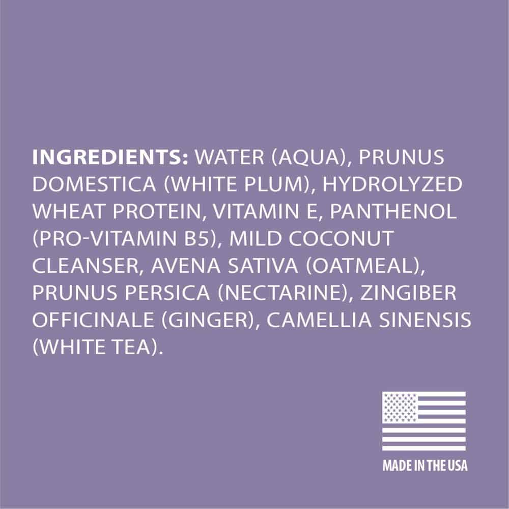 | Other Ingredients: Water (Aqua), Prunus Domestica (White Plum), Hydrolyzed Wheat Protein, Vitamin E, Panthenol (Pro-Vitamin B5), Mild Coconut Cleanser, Avena Sativa (Oatmeal), Prunus Persica (Nectarine), Zingiber Officinale (Ginger), Camellia Sinensis (White Tea). |