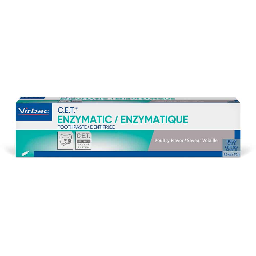 - C.E.T. Enzymatic Toothpaste is formulated for use in dogs and cats as part of a three-step program of home dental care involving brushing, rinsing, and chewing.