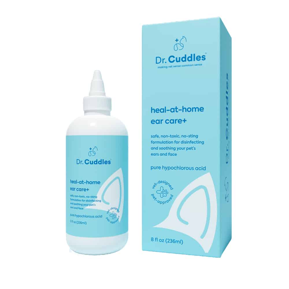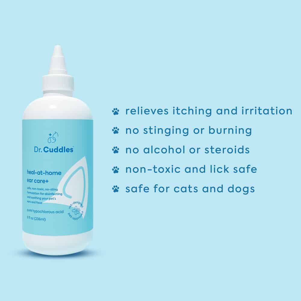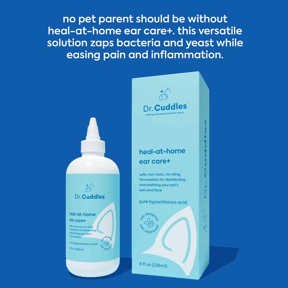 Whether your pet is going face first into the dirt or paw first into the pool, Dr. Cuddle's Heal-at-home ear care+ is the perfect solution for keeping your pet’s ears squeaky clean.