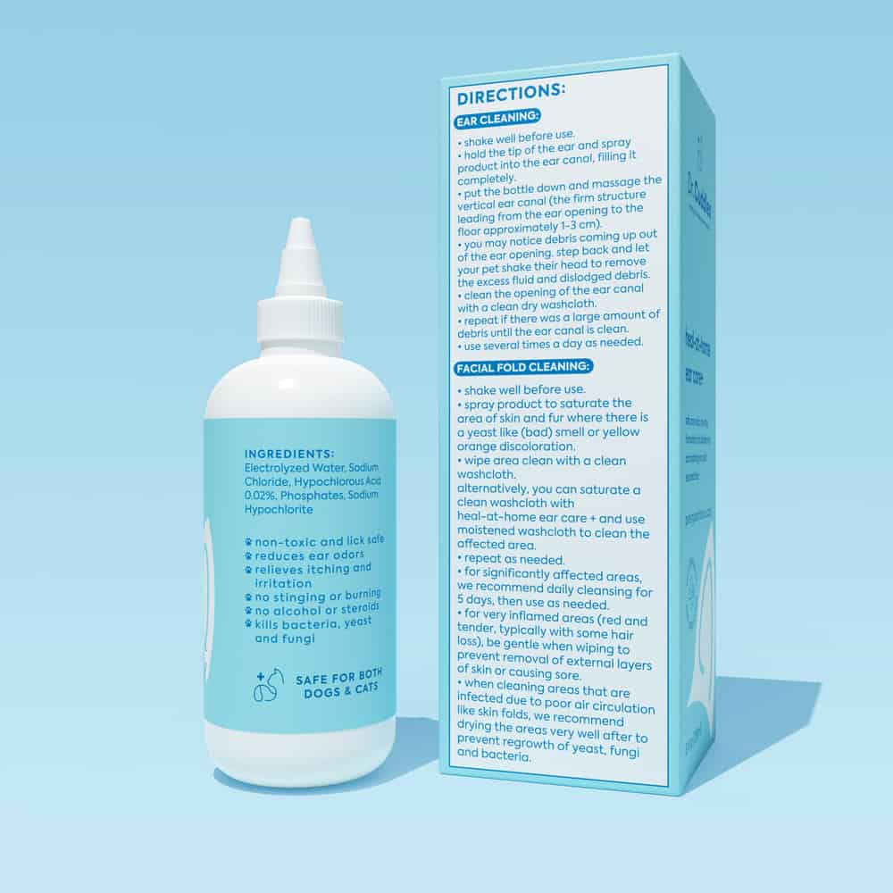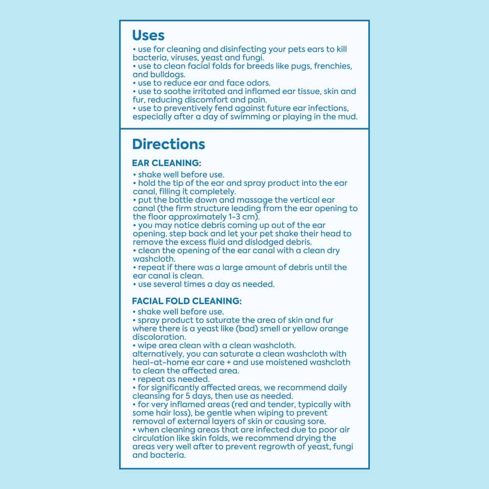 - DIRECTIONS FOR FACIAL FOLD CLEANING: Shake well before use. Spray product to saturate the area of skin and fur where there is a yeast like (bad) smell or yellow orange discoloration. Wipe area clean with a clean washcloth. Alternatively, you can saturate a clean washcloth with the heal at home ear care+ and use moistened washcloth to clean the affected area.
