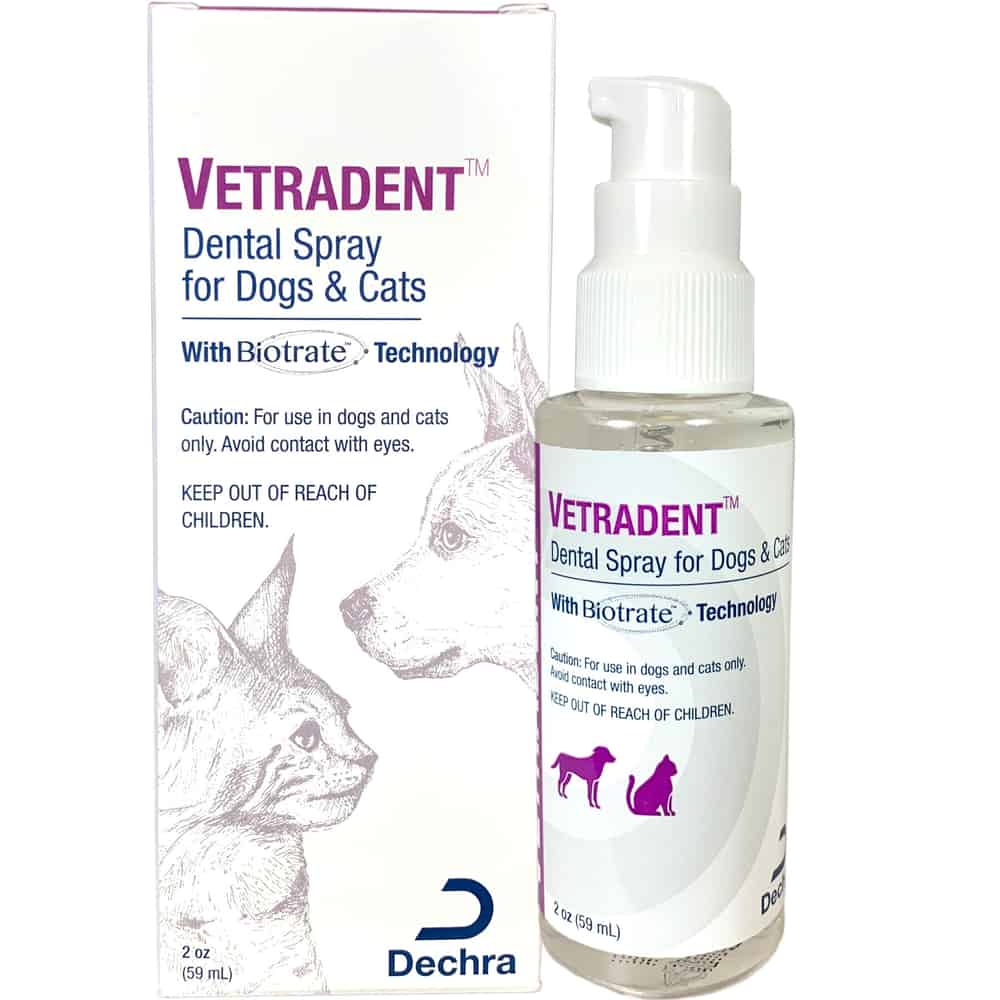 Vetradent Dental Spray is a solution scientifically formulated with Biotrate Technology to control plaque and tartar and freshen breath. The rinseless, easy-to-use spray can be sprayed directly into the mouth. It is a quick and easy at-home dental care alternative to water additives and wipes. Vetradent Dental Spray features a no-startle silent spray nozzle for pets that might be skittish. Vetradent Dental Spray is available in a 2 oz spray bottle.