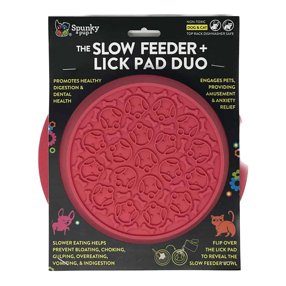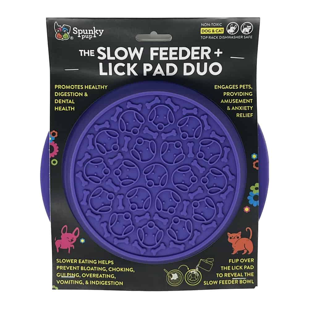 The Spunky Pup Slow Feeder & Lick Pad Duo Combo Bowl encourages mindful eating to prevent gulping, while the lick pad provides a fun, interactive way to enjoy soft treats or spreads, keeping dogs entertained and mentally stimulated.
