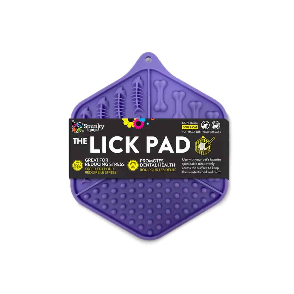 The Hexagon Lick Pad from Spunky Pup will keep your dog or cat entertained and help reduce stress. Spread your pet's favorite spreadable treat evenly across the surface to keep them entertained and calm, even in stressful situations like grooming, nail-clipping, and thunderstorms. Made of durable Non-toxic TPR Rubber. Top shelf dishwasher safe. Perfect for canned pet food, peanut butter, mashed bananas, and vegetable purees.