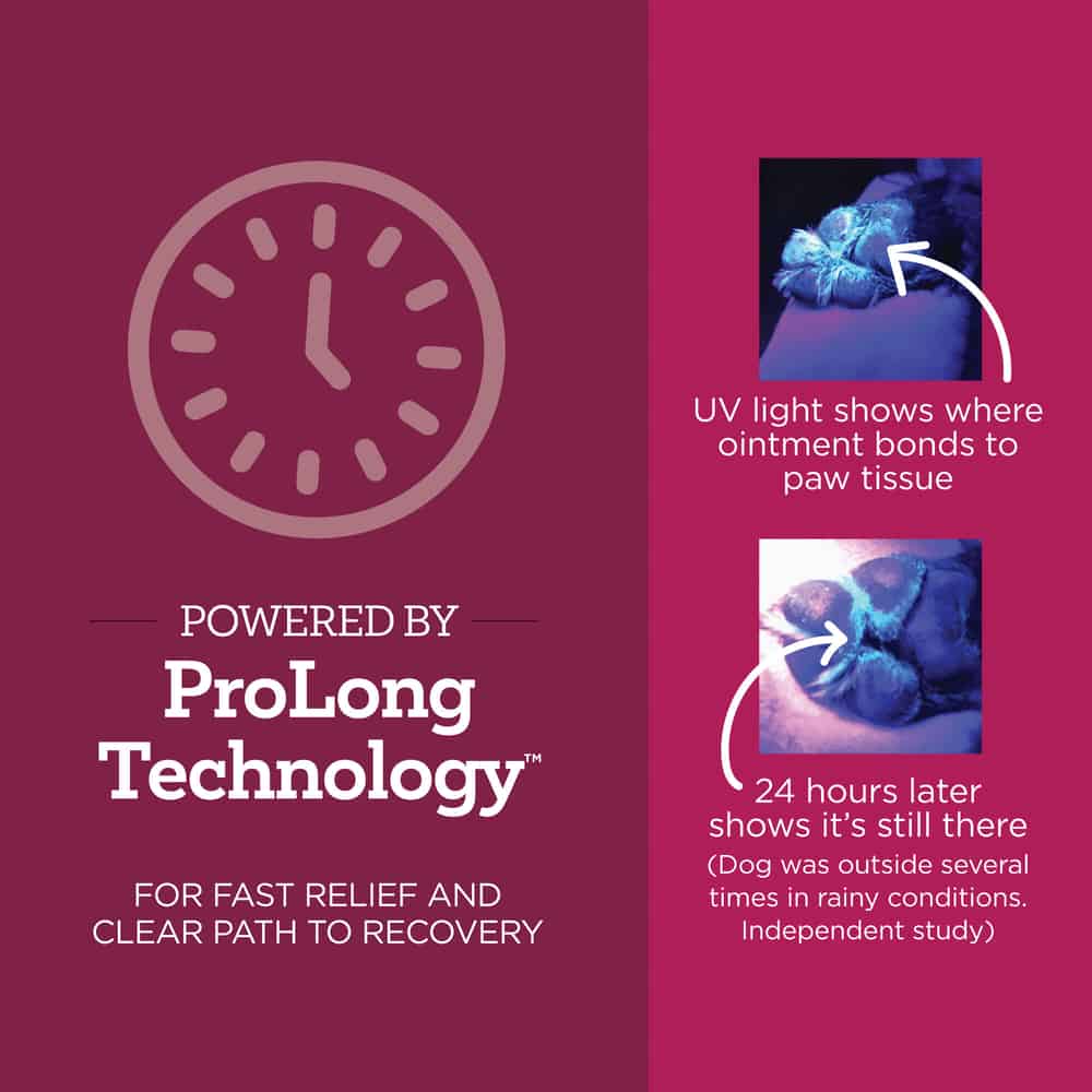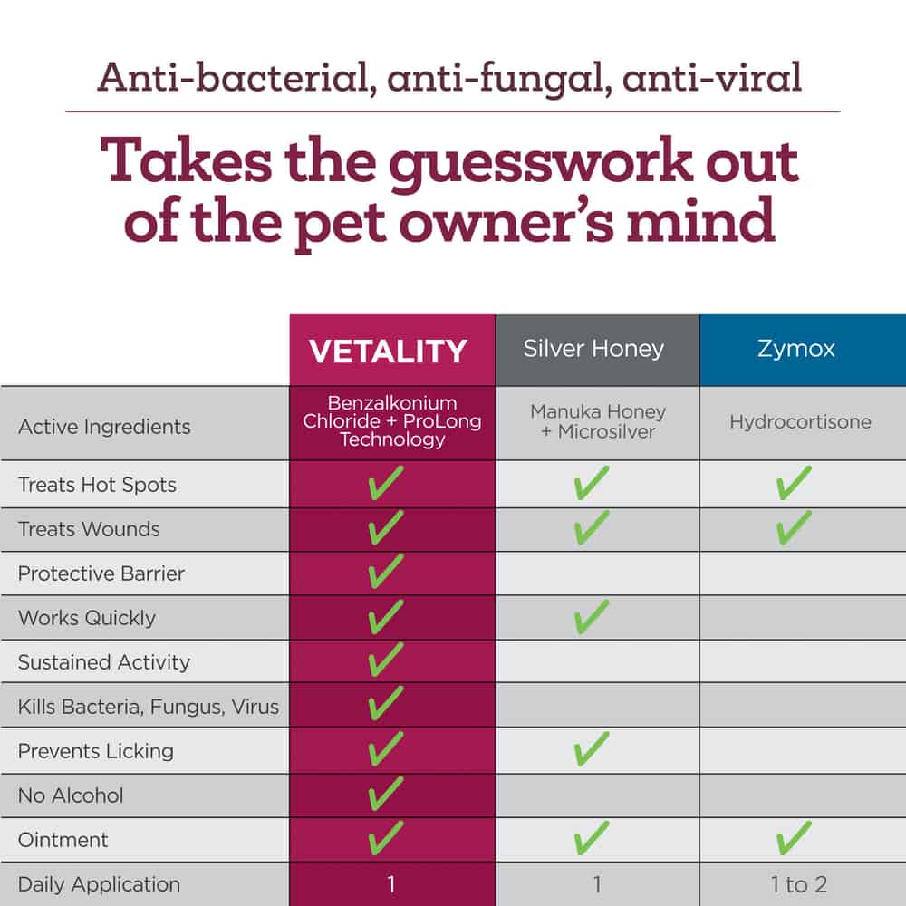 Vetality Hotspot and Wound Ointment for Dogs uses our PROLONG Technology to help hot spots heal fast. This ointment bonds to the wound, creates a barrier and quickly kills bacteria. The bittering agent helps deter licking so the ointment cannot be licked or washed off and helps to hydrate skin in and around the wounds.