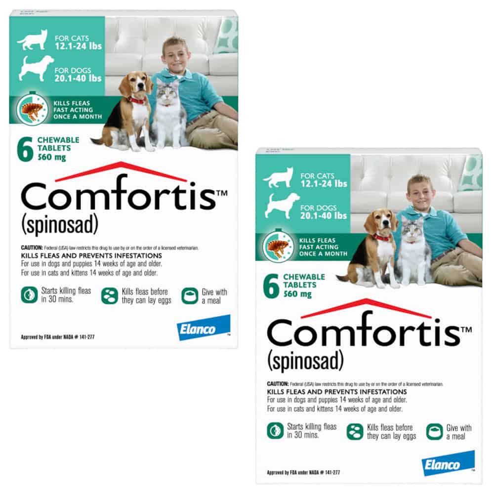 Comfortis is a prescription medication FDA approved for use in dogs and puppies and cats and kittens 14 weeks of age or older to kill fleas and prevent flea infestations for one month. Comfortis is available in a Pink box for dogs 5 to 10 lbs and cats 4.1-6 lbs (140 mg), Orange box for dogs 10.1 to 20 lbs and cats 6.1-12 lbs (270 mg), Green box for dogs 20.1 to 40 lbs and cats 12.1-24 (560 mg), Blue box for dogs 40.1 to 60 lbs (810 mg), and Brown box for dogs 60.1 to 120 lbs (1620 mg). Please note: Cats over 24 lbs should be administered the appropriate combination of tablets.