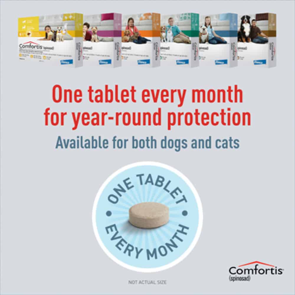 Comfortis is a prescription medication FDA approved for use in dogs and puppies and cats and kittens 14 weeks of age or older to kill fleas and prevent flea infestations for one month. Comfortis is available in a Pink box for dogs 5 to 10 lbs and cats 4.1-6 lbs (140 mg), Orange box for dogs 10.1 to 20 lbs and cats 6.1-12 lbs (270 mg), Green box for dogs 20.1 to 40 lbs and cats 12.1-24 (560 mg), Blue box for dogs 40.1 to 60 lbs (810 mg), and Brown box for dogs 60.1 to 120 lbs (1620 mg). Please note: Cats over 24 lbs should be administered the appropriate combination of tablets.