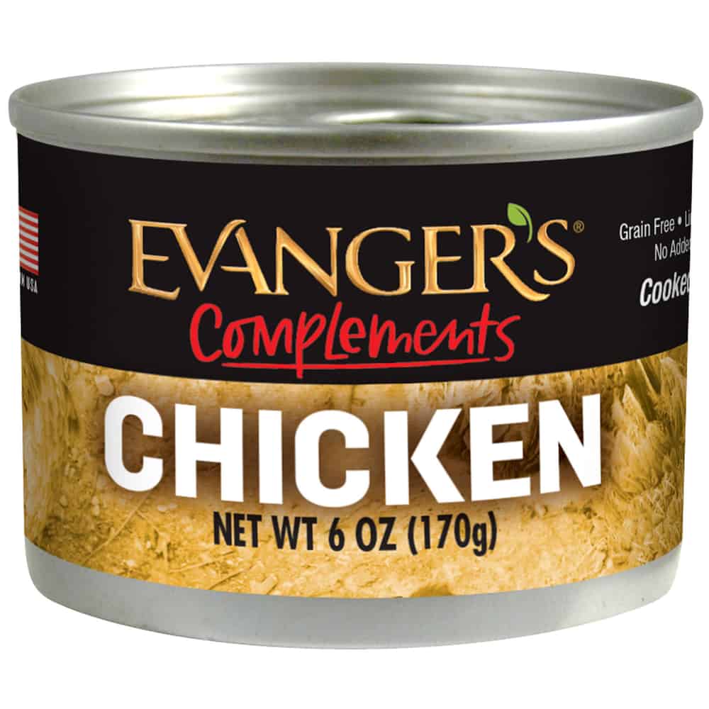 - Feed according to the guidelines. Evanger's Canned Chicken is pure meat, so it should be used as a complement with Evanger's Dry Foods, with Evanger's Vegetarian Dinner, or with any Evanger's complete and balanced meal.